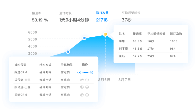 统计每个销售人员的外呼情况,通话时长、接通率等,轻松进行销售过程管控。