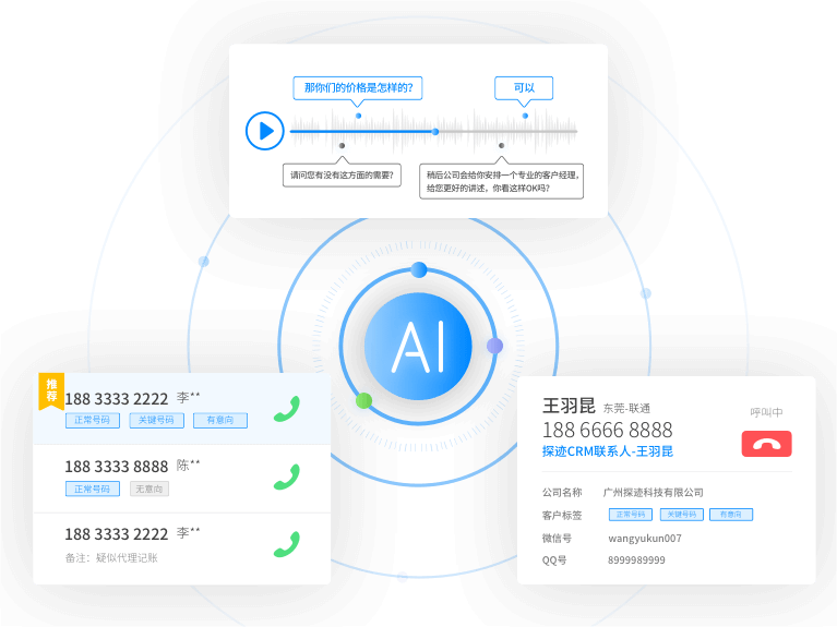 探迹云呼叫中心除了满足传统呼叫中心功能外,还结合大数据和AI帮助优化外呼场景和进行数据优化,帮助销售实现高效沟通。