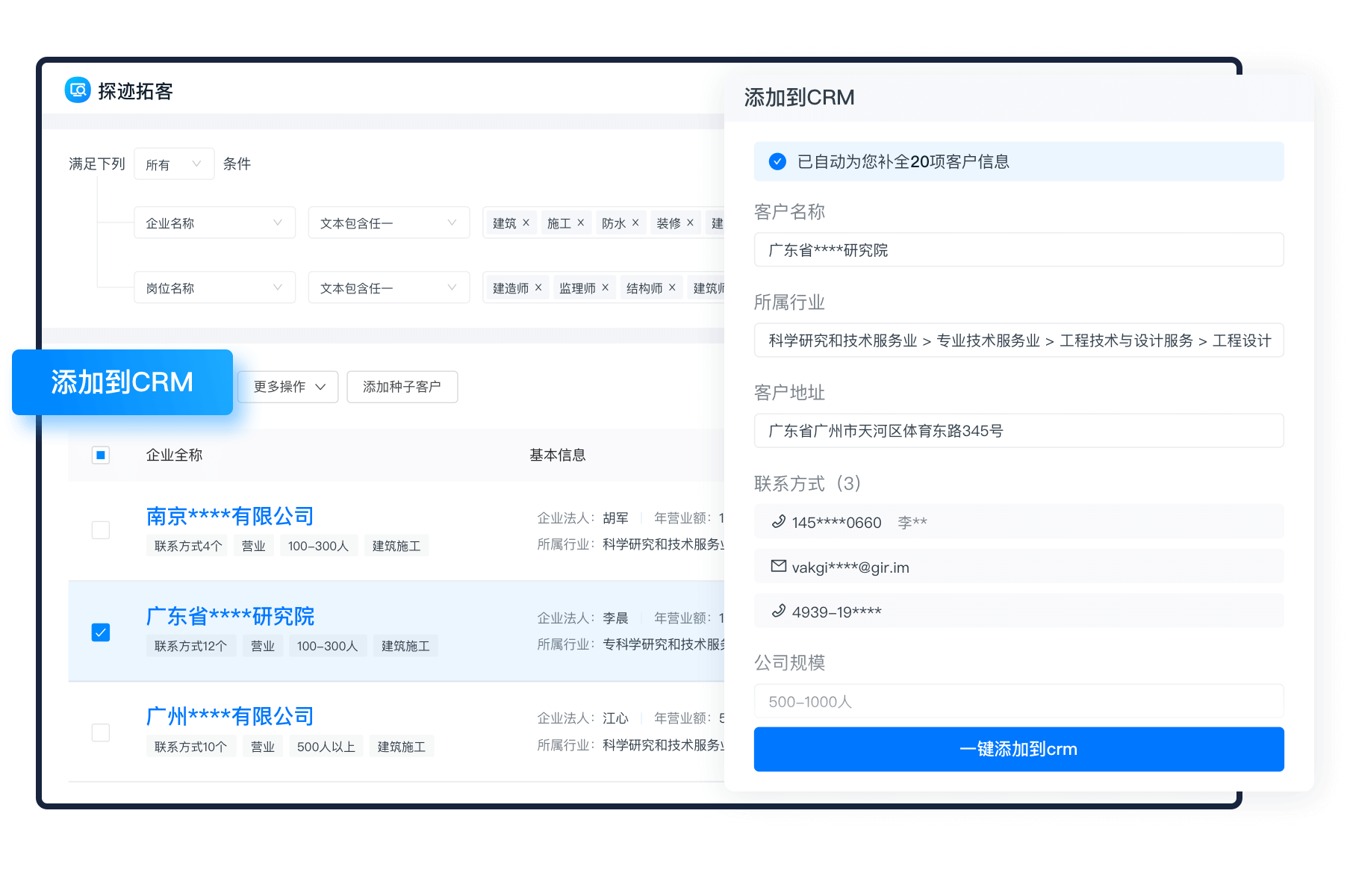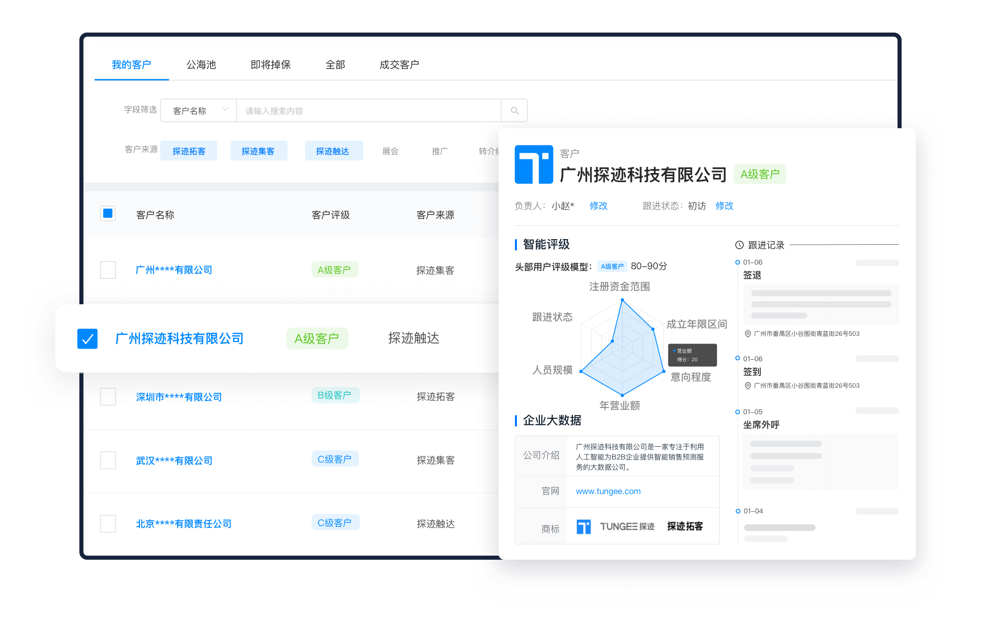 与探迹拓客的全量企业知识图谱打通,实现客户企业信息快速录入和自动更新,减轻人工录入和更新客户数据的负担,降低销售使用门槛