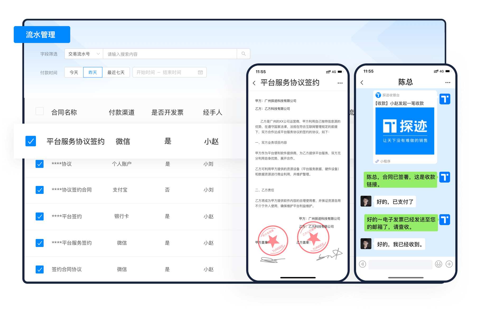 支持在线签署电子合同、发起收款和开具电子发票,每发生一笔回款,系统实时生成流水,且自动关联合同和发票,可实时在线对账