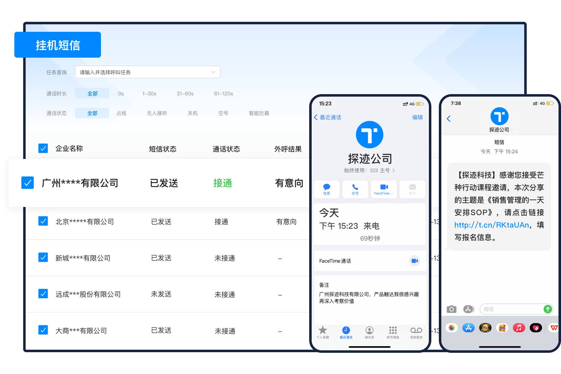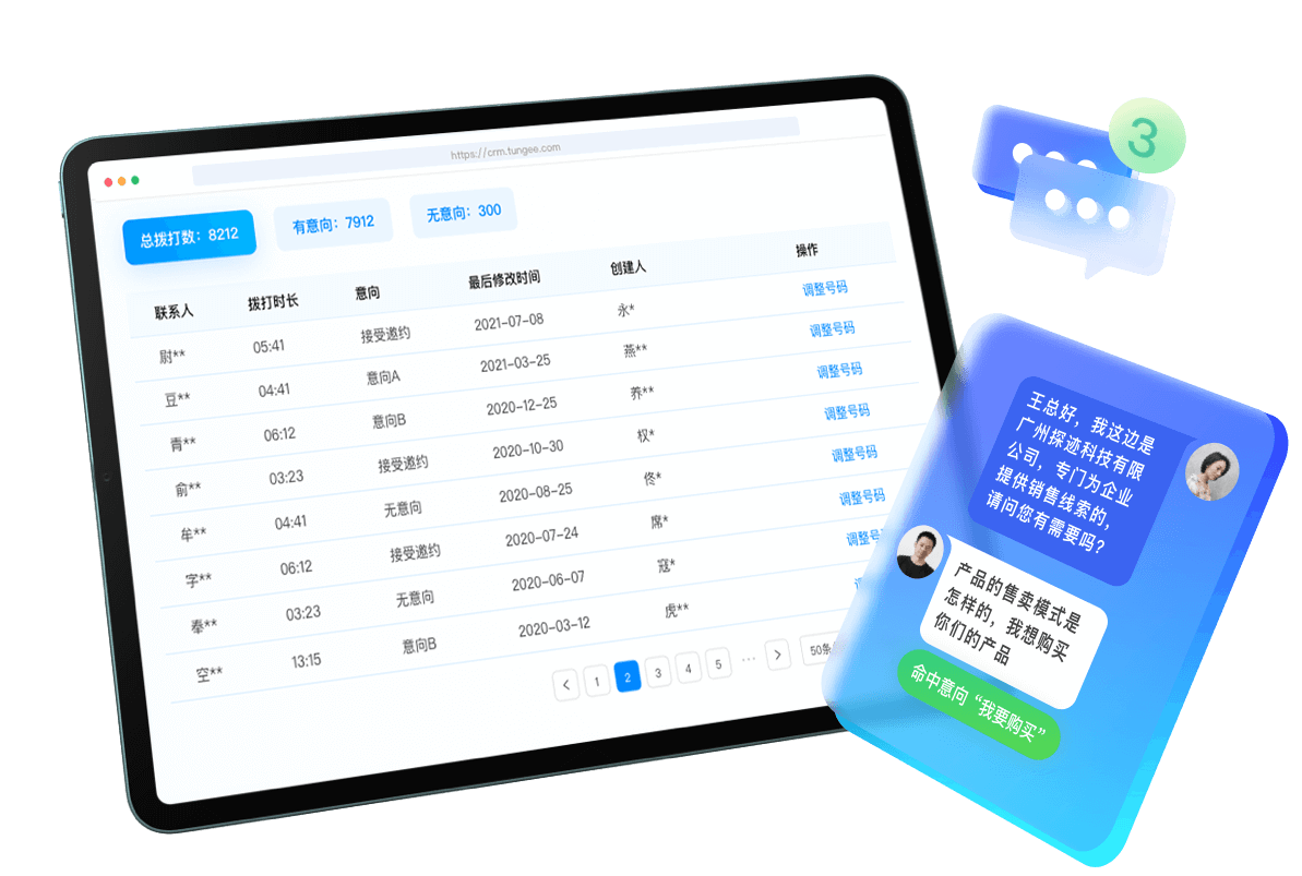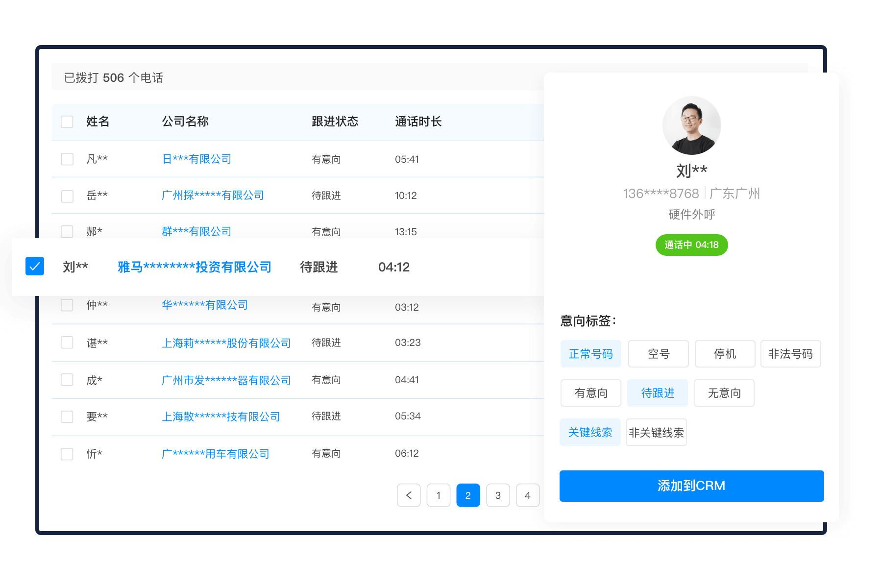无需另外部署电销系统,全平台支持一键拨打电话,呼叫任务自动执行,接通自动转交人工;每次呼叫自动形成跟进记录,客户意向标签全平台互通