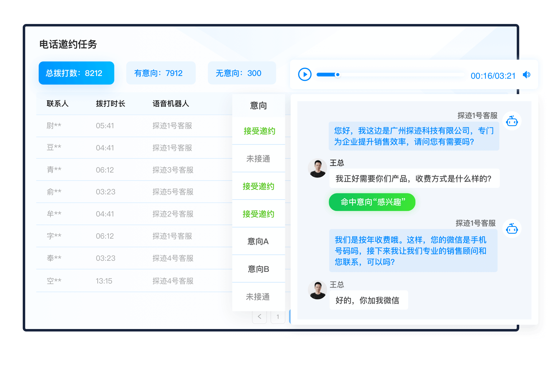 AI机器人代替人工发起批量电话外呼任务,模拟真人语音交流,智能引导客户对话,自动判定和标记客户意向,提高线索初筛效率,快速挖掘出高价值客户