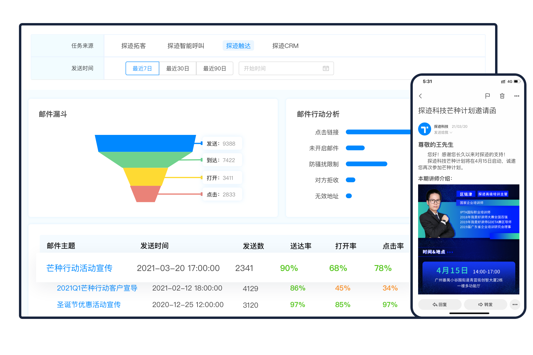 提供海量精准邮箱地址,满足多场景个性化营销;邮件送达率、打开率和点击率可视化呈现,实时分析客户行为,展示营销效果,并支持接收客户回复邮件