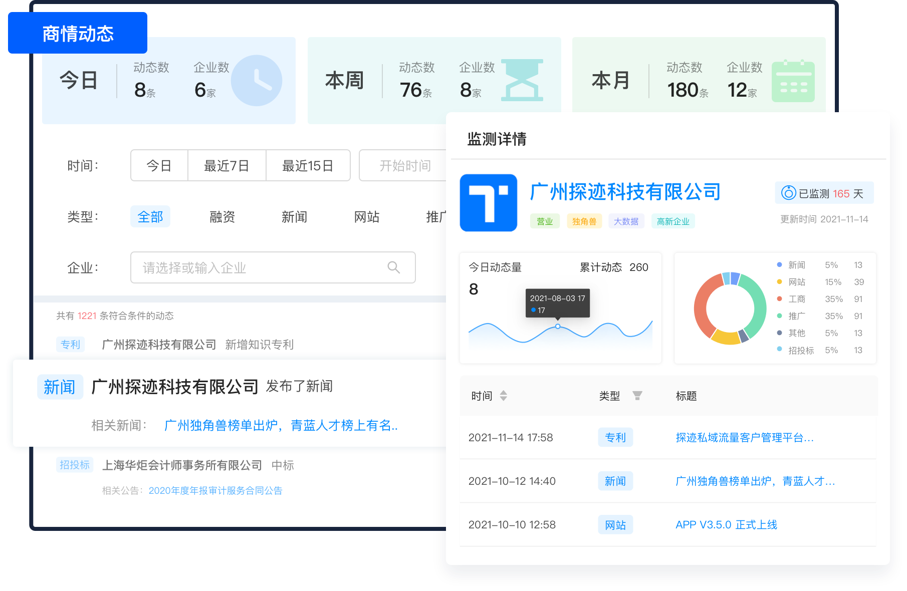 实时监测企业的新闻、推广、工商变更、招投标和资质专利更新等信息,并自动推送新增动态,及时洞察行业新方向,把握市场新商机