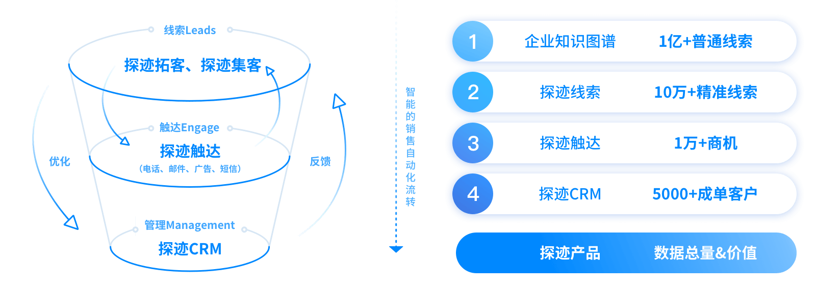 探迹利用大数据+AI,构建了涵盖线索发现、商机触达到客户管理的全流程智能销售云平台,帮助To B企业全面提升销售效率
